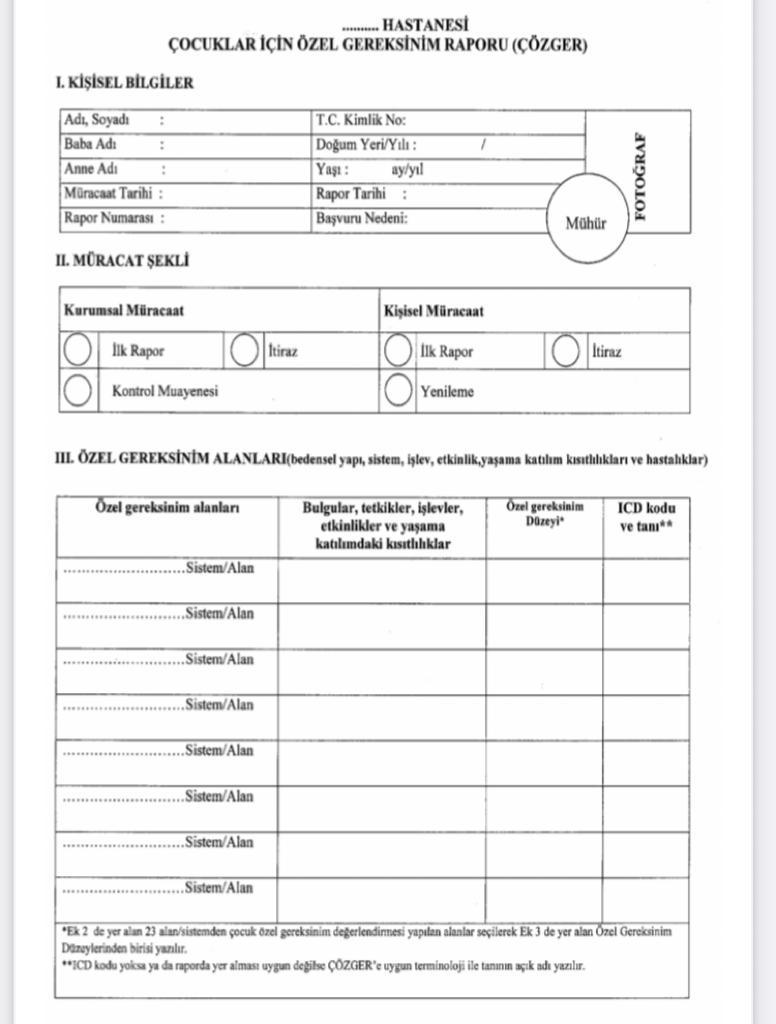 Raporda engellidir ibaresi kaldırılmış olup, yerine özel gereksinim kullanılmaktadır ve ağır engelli ibaresi de artık kullanılmamaktadır. İçerikte belirtilen durumlar dışında ÇÖZGER en az 2 yıl süreli verilir. Çocukların özel gereksinimlerinin hızla değişmeyeceğini düşünüldüğü durumlarda çocukların, ailenin ve ÇÖZGER kurumları çalışanlarının süreçteki zaman ve iş gücü kaybı gözetilerek rapor daha uzun süreli ya da sürekli olarak verilebilir. Özetle ÇÖZGER’in kapsamı bu şekilde olup detaylara ve İlgili yönetmeliğe aşağıda yer alan adresten ulaşabilirsiniz. Ayrıca yazının en sonuna ÇÖZGER raporuna ilişkin örnek olması adına örnek rapor görüntülerini inceleyebilirsiniz.