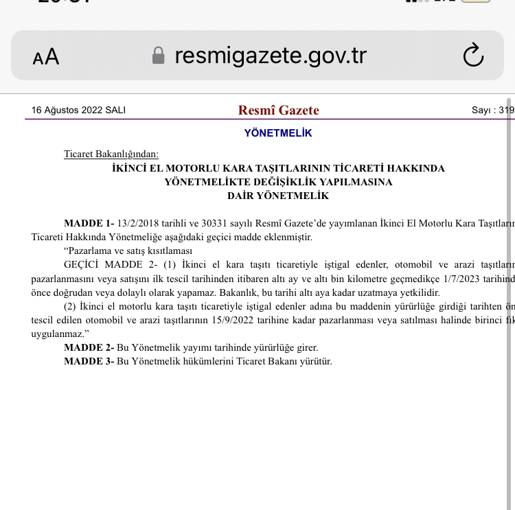 İkinci El Araç Satışlarına Dair Kısıtlama, Yeni Dönem Uygulama Hakkında; Motorlu Kara Taşıtlarının Ticareti Hakkında Yönetmelikte Değişiklik Yapılmasına Dair Yönetmelik, Resmi Gazete’de yayımlanarak 16.08.2022 tarihinde 31925 sayısı ile yürürlüğe girdi.